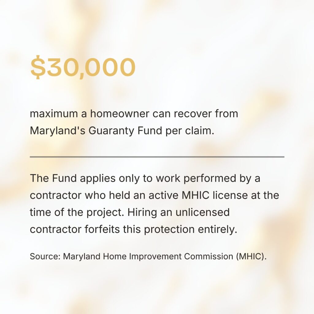 Maryland operates a contractor-supported Guaranty Fund that can compensate homeowners for documented monetary losses due to poor workmanship or failure to perform. Two important limitations: it only applies to work done by a licensed contractor, and recovery is capped at the amount you paid, up to $30,000. If you hire an unlicensed contractor, you cannot file a Guaranty Fund claim. That protection disappears entirely.