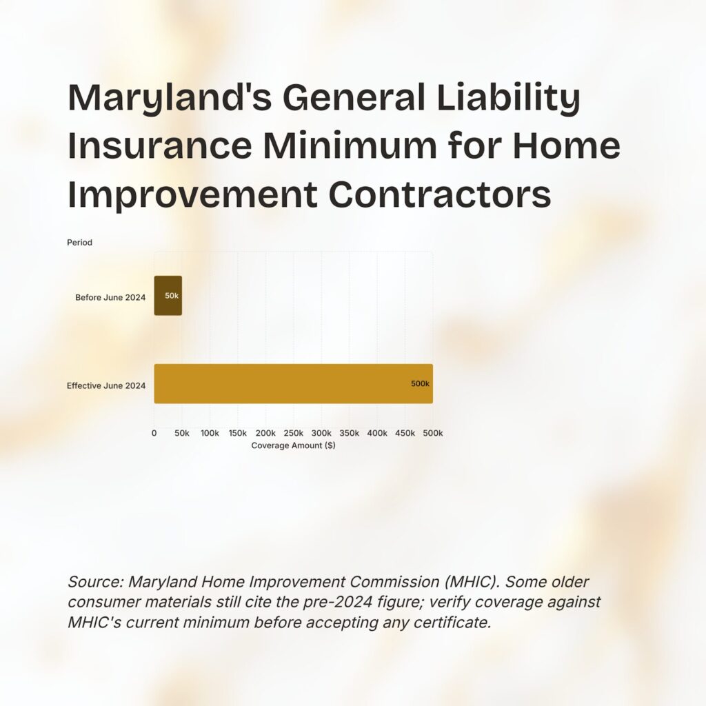 As of June 1, 2024, Maryland requires home improvement contractors to carry at least $500,000 in general liability insurance. Some older consumer materials reference a lower threshold, so go directly to the MHIC’s current guidance and request a certificate of insurance that confirms active coverage dates. Also ask about workers’ compensation coverage for the crew working in your home.