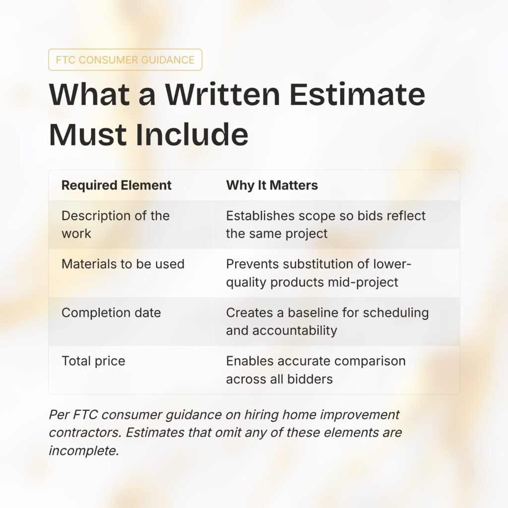 The Federal Trade Commission makes the same point: a written estimate should include a description of the work, materials, completion date, and price. It also warns against automatically choosing the lowest bidder and suggests asking why an estimate is much higher or lower than the others.