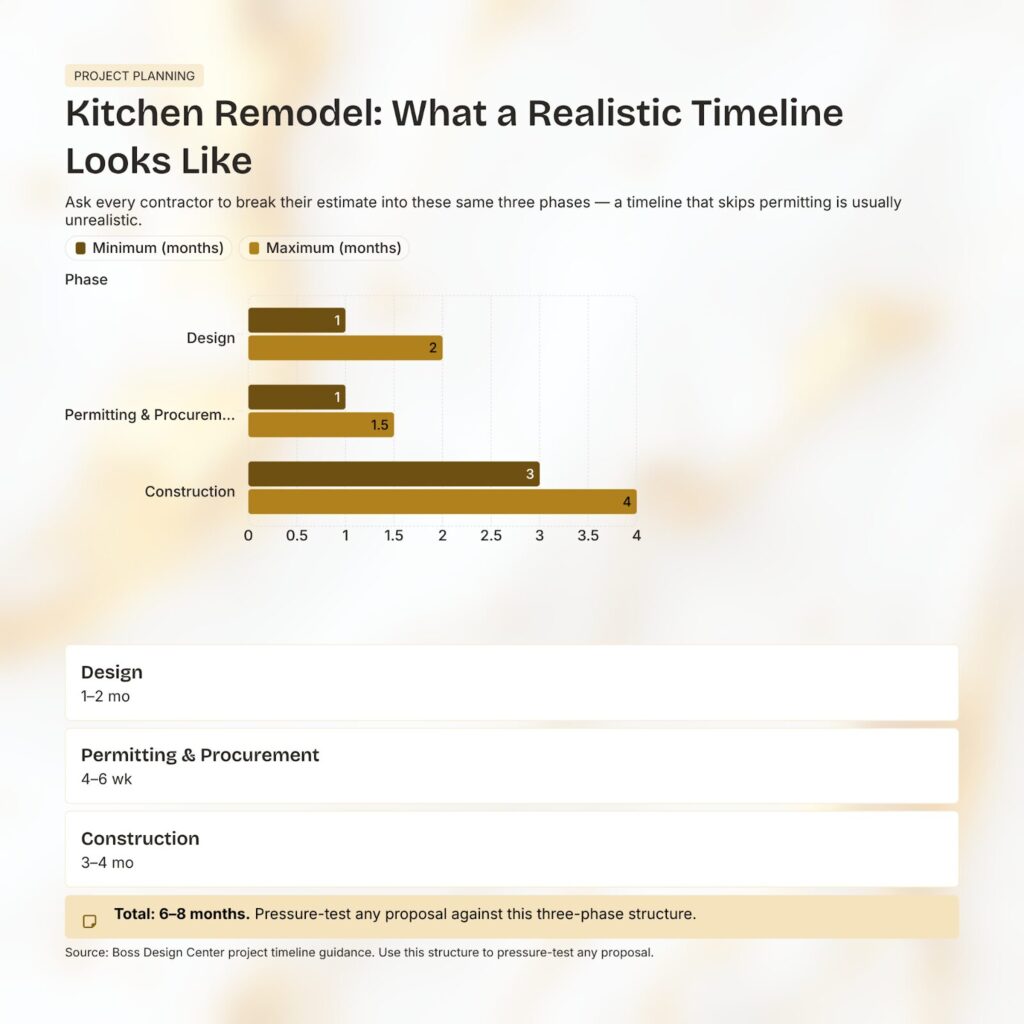 Our process runs in three distinct phases: one to two months for design, four to six weeks for permitting and procurement, then three to four months of active construction. Six to eight months in total. When comparing proposals, ask every contractor to break their timeline into the same three phases: design, permitting and procurement, and construction. A timeline that compresses or skips the permitting phase is usually unrealistic.