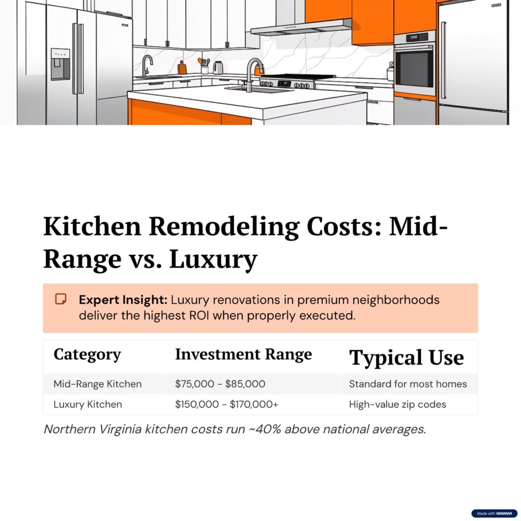 | Kitchen Remodel | $75,000 – $85,000 | $150,000 – $170,000+ |