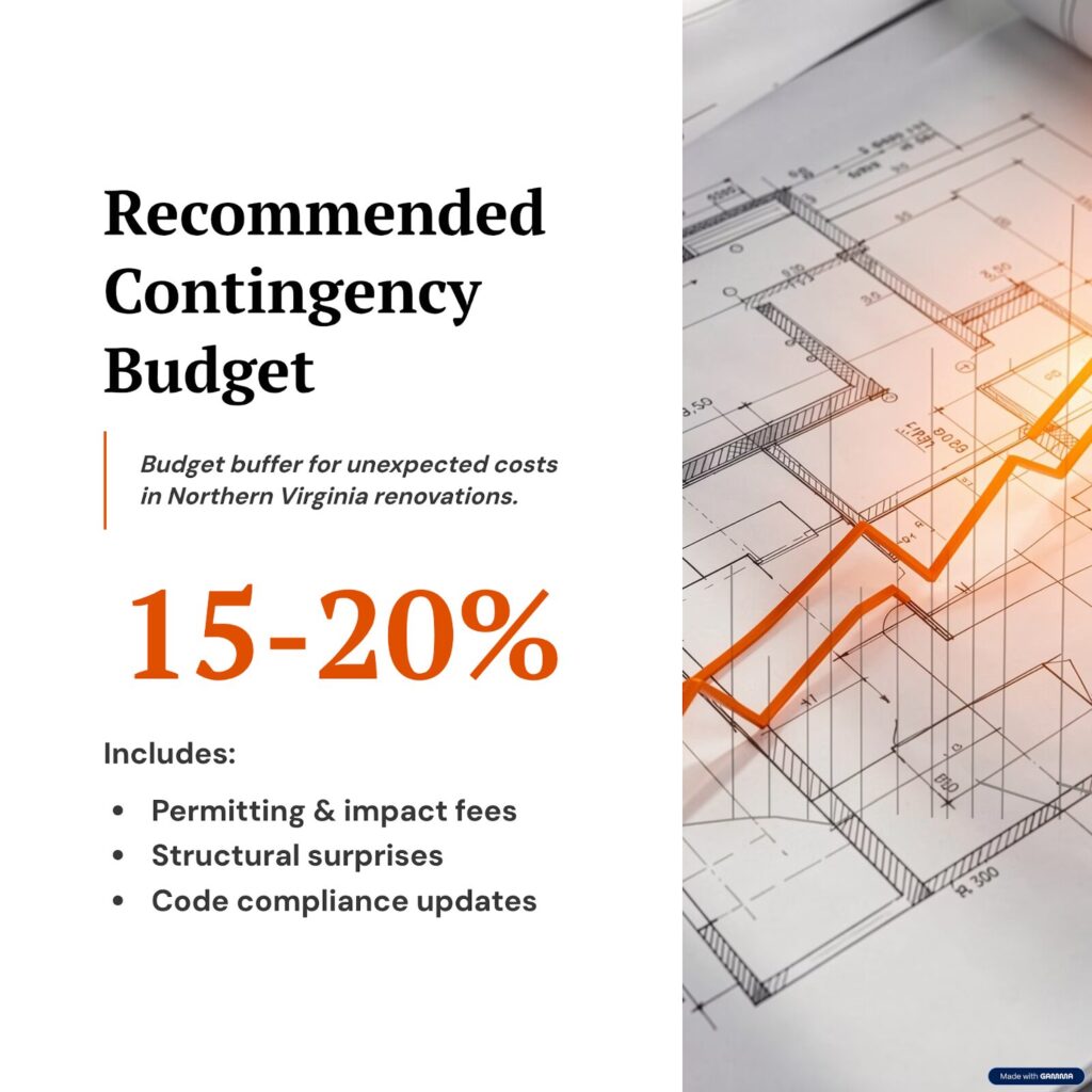 Structural Surprises: The clay-heavy soil in Fairfax and Prince William often necessitates engineered foundations or soil remediation. Unforeseen structural rot or termite damage in older homes (common in Arlington and Alexandria) emerges once walls are opened.